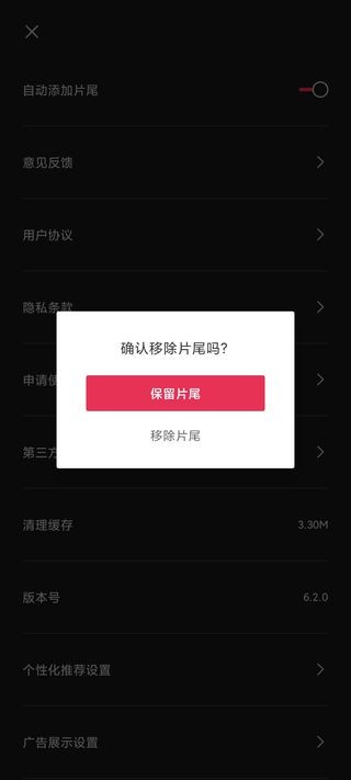 3、打开剪映设置界面,然后点击“自动添加片尾”右侧的按钮关闭自动添加片尾功能;