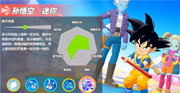 战斗时和敌人维持一定空间,擅长中距离作战的英雄。战斗越激烈,斗志越昂扬!施展凶猛的如意棒突击,带上庞吉和古罗里奥一起大闹一场吧!