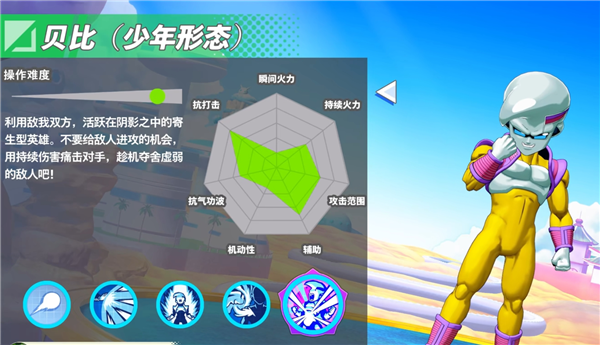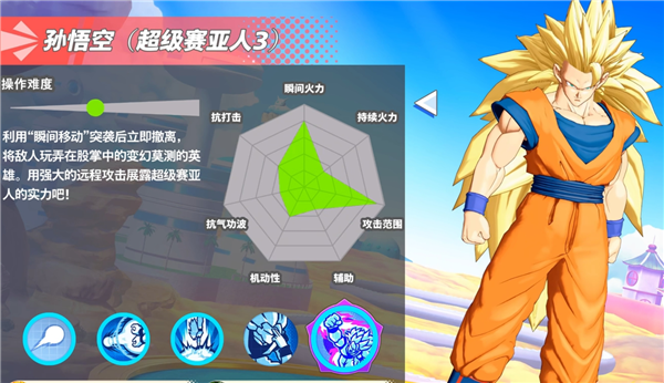 利用"瞬间移动"突袭后立即撤离,将敌人玩弄在股掌中的变幻莫测的英雄。用强大的远程攻击展露超级赛亚